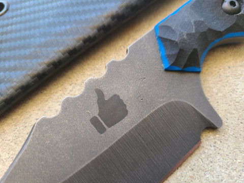 For those that remember my smashed thumb from a few months back, this was the knife that it broke on, thus the faint maker's mark with commemorative "thumbs up" etching. Scales are "black and blue" to match the way my thumb looked after the injury. Own a piece of TPK history đ