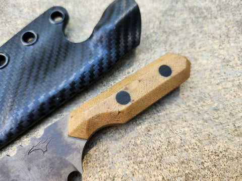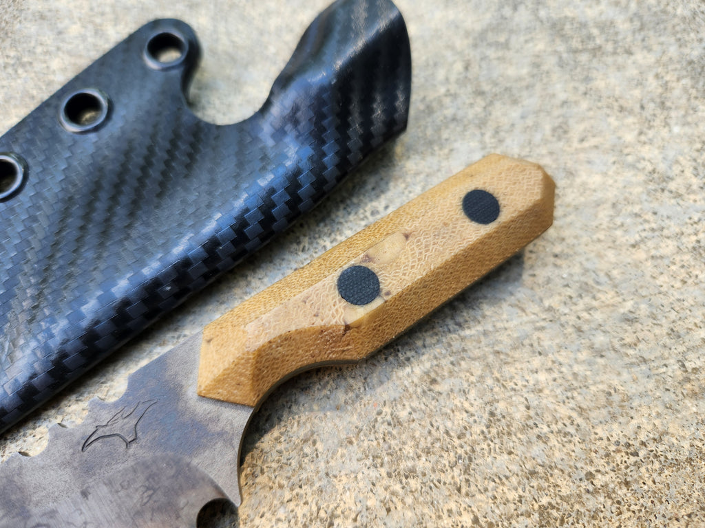 - Razor sharp Mini Camper in CRUWEAR steel with Almond Crosscut Micarta scales and Black Micarta pins
